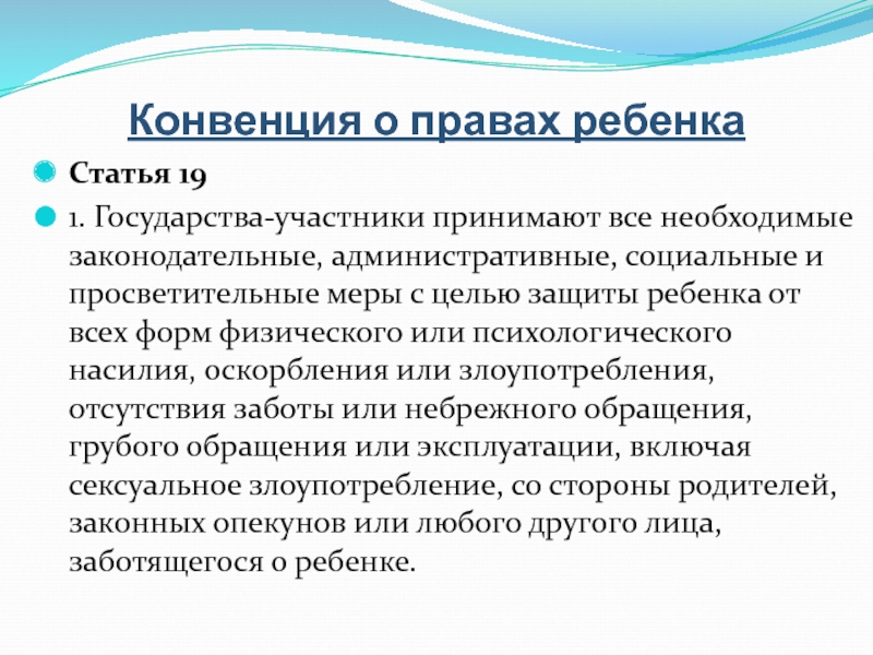 от всех форм физического или психологического насилия, оскорбления или злоупотребления, отсутствия заботы или небрежного обращения, грубого обращения или эксплуатации, включая сексуальное злоупотребление, со стороны родителей, законных опекунов или любого другого лица, заботящегося о ребенке.