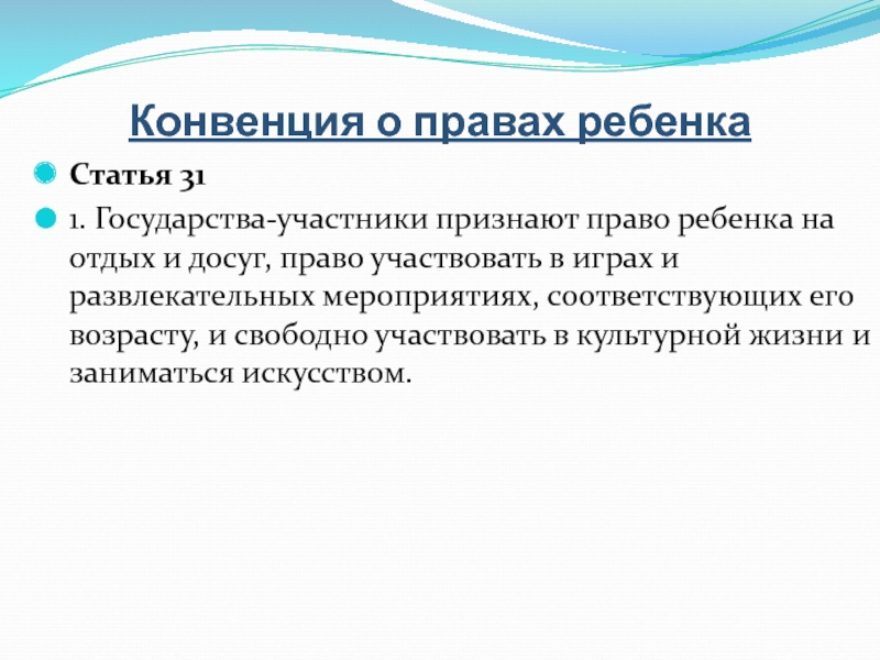 мероприятиях, соответствующих его возрасту, и свободно участвовать в культурной жизни и заниматься искусством.