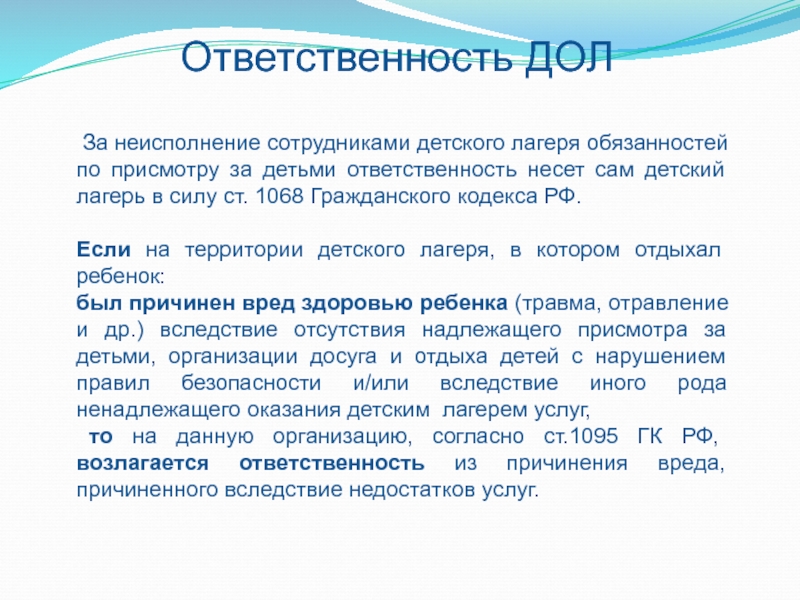 Слайд 25 За неисполнение сотрудниками детского лагеря обязанностей по присмотру за детьми