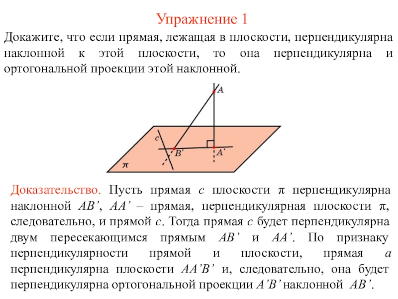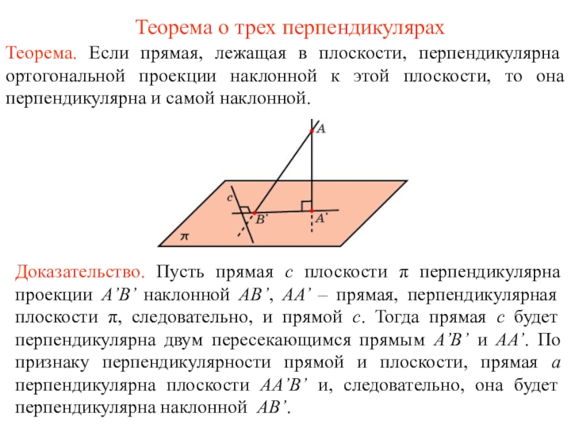 Отрезок AA’ называется перпендикуляром, опущенным из точки A на плоскость π.