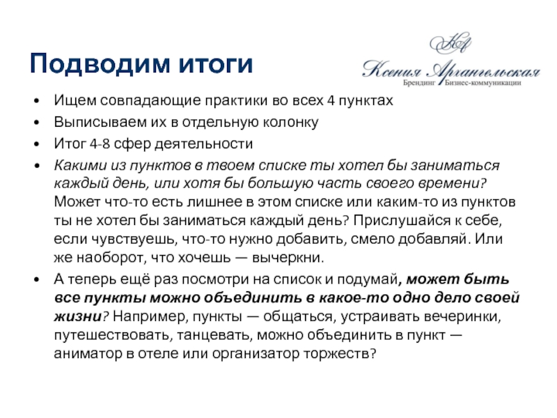 А теперь ещё раз посмотри на список и подумай, может быть все пункты можно объединить в какое-то одно дело своей жизни? Например, пункты — общаться, устраивать вечеринки, путешествовать, танцевать, можно объединить в пункт — аниматор в отеле или организатор торжеств?