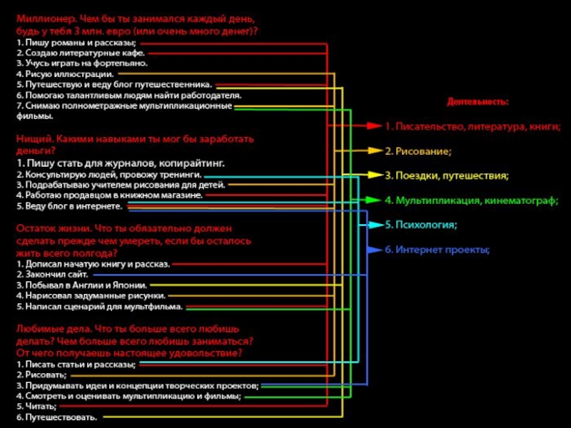 ты хотел бы заниматься каждый день, или хотя бы большую часть своего времени? Может что-то есть лишнее в этом списке или каким-то из пунктов ты не хотел бы заниматься каждый день? Прислушайся к себе, если чувствуешь, что-то нужно добавить, смело добавляй. Или же наоборот, что хочешь — вычеркни.
