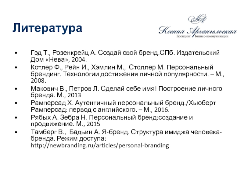 Гэд Т., Розенкрейц А. Создай свой бренд.СПб. Издательский Дом «Нева»,