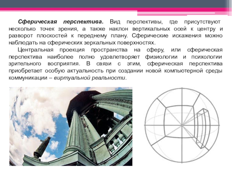 этого пространства человеком.Во второй половине 20 века советский академик Б.В. Раушенбах, занимавшийся фундаментальными исследованиями в области ракетной техники и космических полетов, создал и математически обосновал общую теорию перспективы. При построении своей теории он исходил из того, что зрительное восприятие человека двухступенчатое. Первой ступенью является образование изображения объективного пространства на сетчатке глаза, а второй – воссоздание на этой основе облика внешнего пространства в человеческом сознании (перцептивного пространства) посредством сложной работы головного мозга.