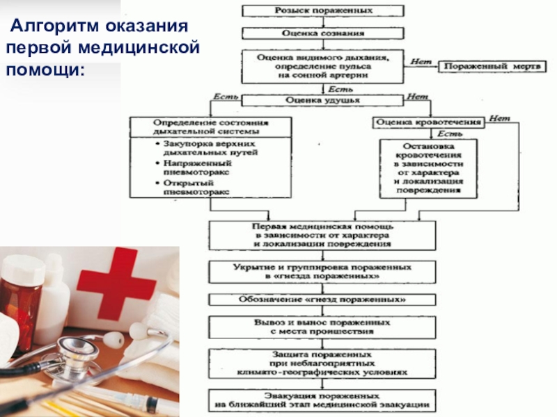 Слайд 5 Алгоритм оказания первой медицинской помощи: