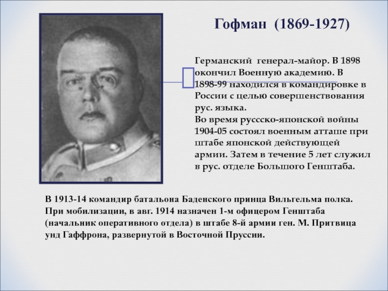 В 1913-14 командир батальона Баденского принца Вильгельма полка. При мобилизации, в авг. 1914 назначен 1-м офицером Генштаба (начальник оперативного отдела) в штабе 8-й армии ген. М. Притвица унд Гаффрона, развернутой в Восточной Пруссии.