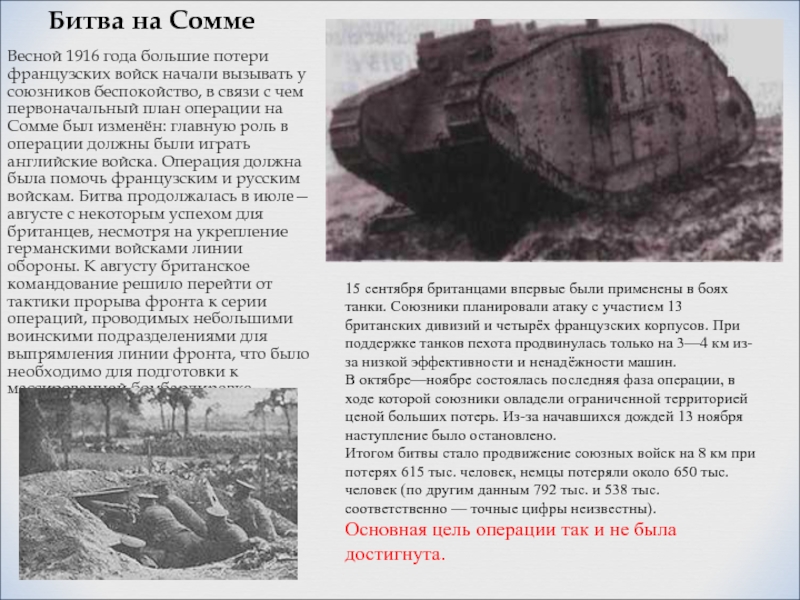 15 сентября британцами впервые были применены в боях танки. Союзники планировали атаку с участием 13 британских дивизий и четырёх французских корпусов. При поддержке танков пехота продвинулась только на 3—4 км из-за низкой эффективности и ненадёжности машин.