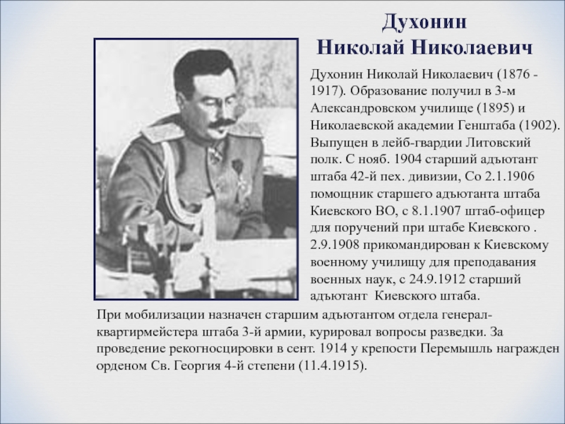 При мобилизации назначен старшим адъютантом отдела генерал-квартирмейстера штаба 3-й армии, курировал вопросы разведки. За проведение рекогносцировки в сент. 1914 у крепости Перемышль награжден орденом Св. Георгия 4-й степени (11.4.1915).