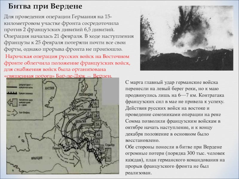 Обе стороны понесли в битве при Вердене огромные потери (порядка 300 тыс. человек каждая), план германского командования на прорыв французского фронта не был реализован.