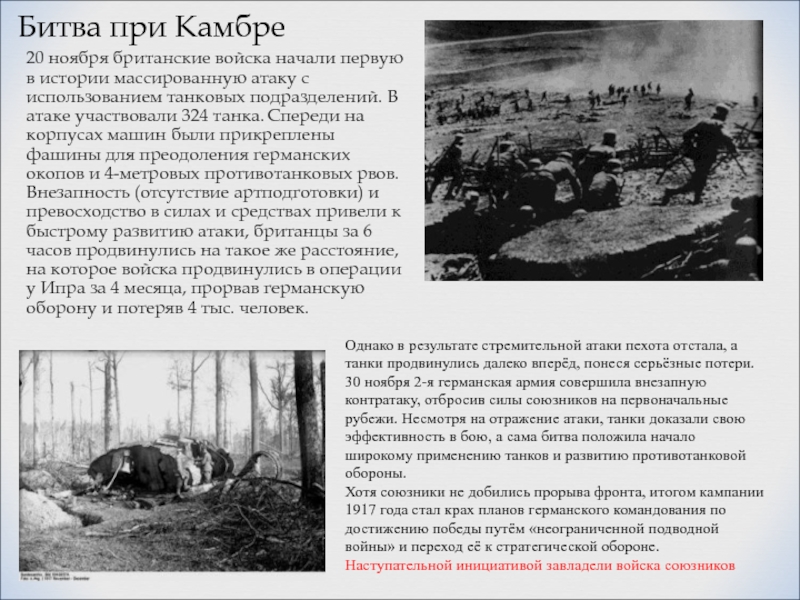 Однако в результате стремительной атаки пехота отстала, а танки продвинулись далеко вперёд, понеся серьёзные потери. 30 ноября 2-я германская армия совершила внезапную контратаку, отбросив силы союзников на первоначальные рубежи. Несмотря на отражение атаки, танки доказали свою эффективность в бою, а сама битва положила начало широкому применению танков и развитию противотанковой обороны.