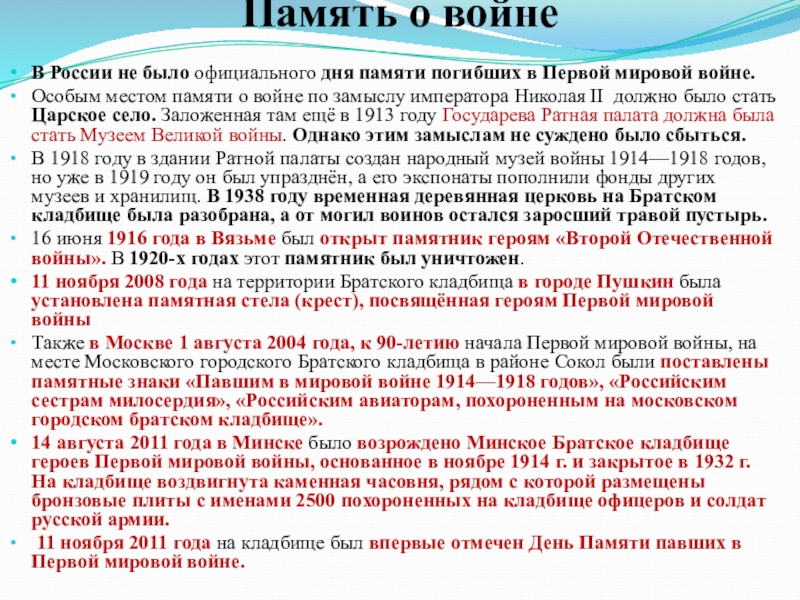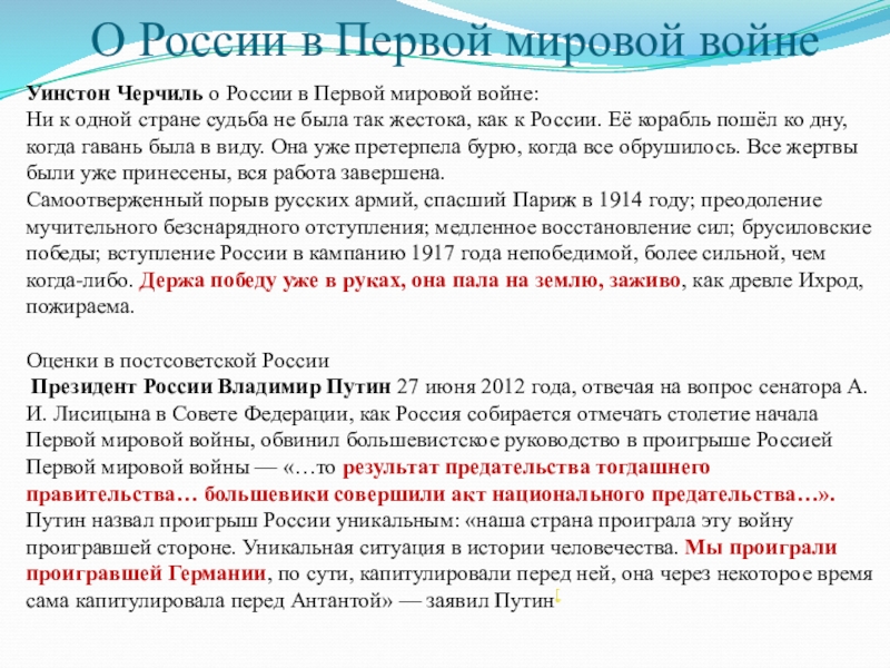 Путин назвал проигрыш России уникальным: «наша страна проиграла эту войну проигравшей стороне. Уникальная ситуация в истории человечества. Мы проиграли проигравшей Германии, по сути, капитулировали перед ней, она через некоторое время сама капитулировала перед Антантой» — заявил Путин[