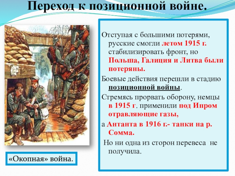 Также появилась «окопная тактика» ведения войны с целью изматывания противника и истощения его экономики, работающей на военные заказы.