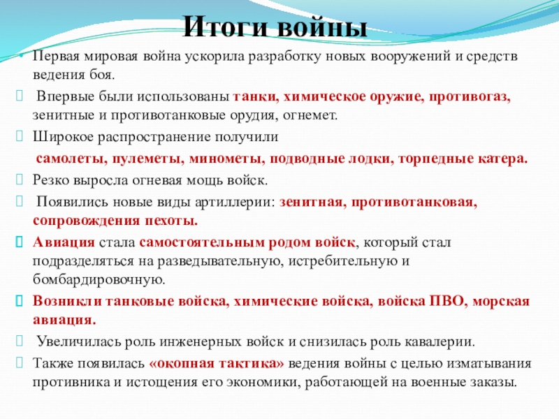 Увеличилась роль инженерных войск и снизилась роль кавалерии.