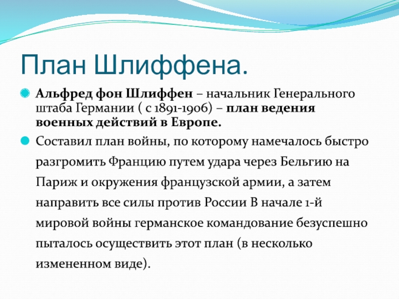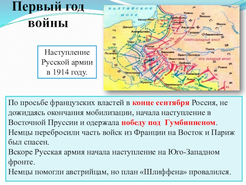 20 августа Германские войска пытаются перейти в наступление в Восточной Пруссии, но терпят поражение под Гумбинненом. Провал этого наступления является началом провала плана Шлиффена.