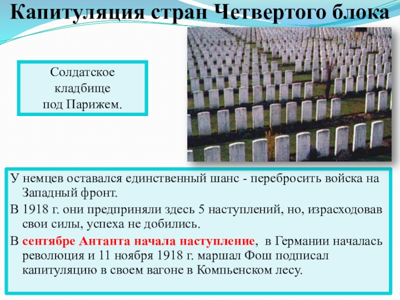 В сентябре Антанта начала наступление, в Германии началась революция и 11 ноября 1918 г. маршал Фош подписал капитуляцию в своем вагоне в Компьенском лесу.