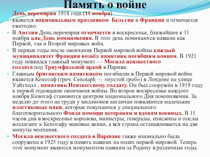 Главным британским памятником погибшим в Первой мировой войне является Кенотаф (греч. Cenotaph — «пустой гроб») в Лондоне на улице Уайтхолл , памятник Неизвестному солдату. Он был сооружён в 1919 году к первой годовщине окончания войны. Во второе воскресенье каждого ноября Кенотаф становится центром национального Дня поминовения. За неделю до этого на груди у миллионов англичан появляются маленькие пластиковые маки, которые покупаются у специального благотворительного Фонда помощи ветеранам и вдовам военных. В 11 часов дня в воскресенье королева, министры, генералы, епископы и послы возлагают к Кенотафу маковые венки, а вся страна останавливается на две минуты молчания.