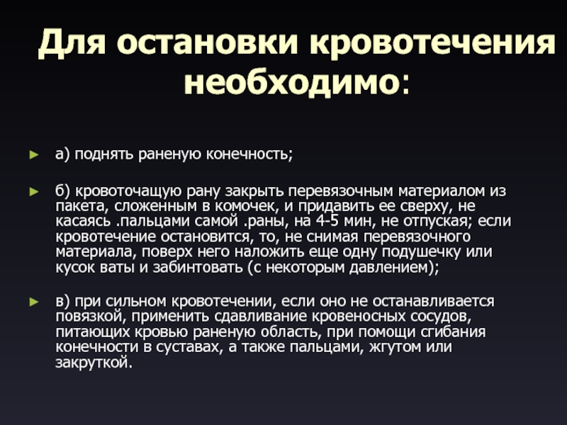в) при сильном кровотечении, если оно не останавливается повязкой, применить сдавливание кровеносных сосудов, питающих кровью раненую область, при помощи сгибания конечности в суставах, а также пальцами, жгутом или закруткой.