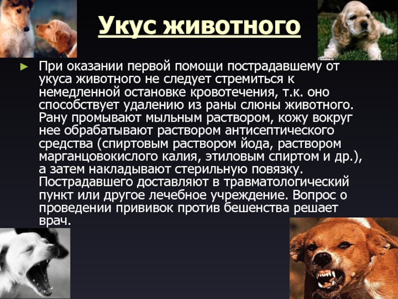 удалению из раны слюны животного. Рану промывают мыльным раствором, кожу вокруг нее обрабатывают раствором антисептического средства (спиртовым раствором йода, раствором марганцовокислого калия, этиловым спиртом и др.), а затем накладывают стерильную повязку. Пострадавшего доставляют в травматологический пункт или другое лечебное учреждение. Вопрос о проведении прививок против бешенства решает врач.