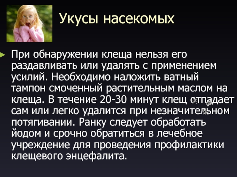 на клеща. В течение 20-30 минут клещ отпадает сам или легко удалится при незначительном потягивании. Ранку следует обработать йодом и срочно обратиться в лечебное учреждение для проведения профилактики клещевого энцефалита.