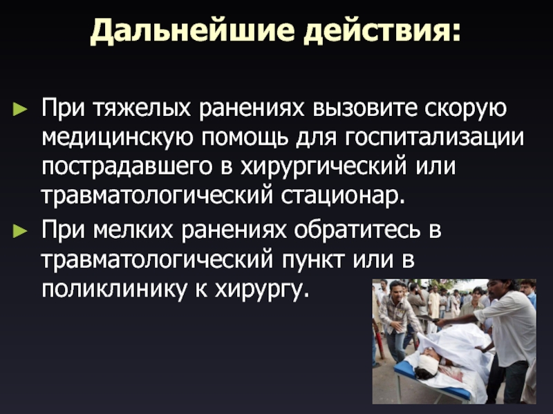 При тяжелых ранениях вызовите скорую медицинскую помощь для