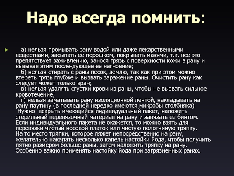 б) нельзя стирать с раны песок, землю, так как при этом можно втереть грязь глубже и вызвать заражение раны. Очистить рану как следует может только врач;