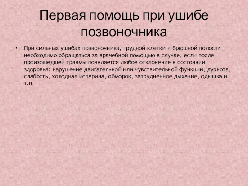 случае, если после произошедшей травмы появляется любое отклонение в состоянии здоровья: нарушение двигательной или чувствительной функции, дурнота, слабость, холодная испарина, обморок, затрудненное дыхание, одышка и т.п.