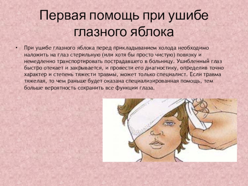 бы просто чистую) повязку и немедленно транспортировать пострадавшего в больницу. Ушибленный глаз быстро отекает и закрывается, и провести его диагностику, определив точно характер и степень тяжести травмы, может только специалист. Если травма тяжелая, то чем раньше будет оказана специализированная помощь, тем больше вероятность сохранить все функции глаза.