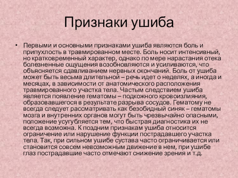 по мере нарастания отека болезненные ощущения возобновляются и усиливаются, что объясняется сдавливанием нервных окончаний. Боль от ушиба может быть весьма длительной – речь идет о неделях, а иногда и месяцах, в зависимости от анатомического расположения травмированного участка тела. Частым следствием ушиба является появление гематомы – подкожного кровоизлияния, образовавшегося в результате разрыва сосудов. Гематому не всегда следует рассматривать как безобидный синяк – гематомы мозга и внутренних органов могут быть чрезвычайно опасными, положение усугубляется тем, что быстрая диагностика их не всегда возможна. К поздним признакам ушиба относится ограничение или нарушение функции пострадавшего участка тела. Так, при сильном ушибе сустава часто ограничивается или становится совсем невозможным движение в нем, при ушибе глаз пострадавшие часто отмечают снижение зрения и т.д.
