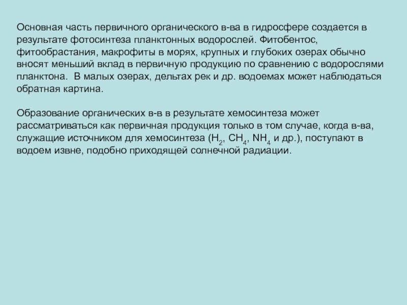 Слайд 6Основная часть первичного органического в-ва в гидросфере создается в результате