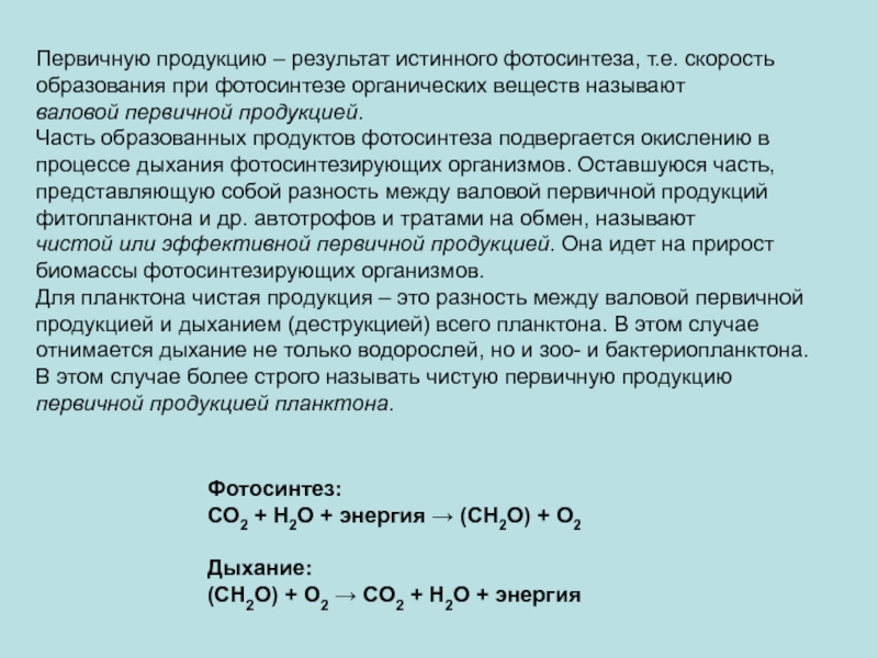 Слайд 7Первичную продукцию – результат истинного фотосинтеза, т.е. скорость образования при