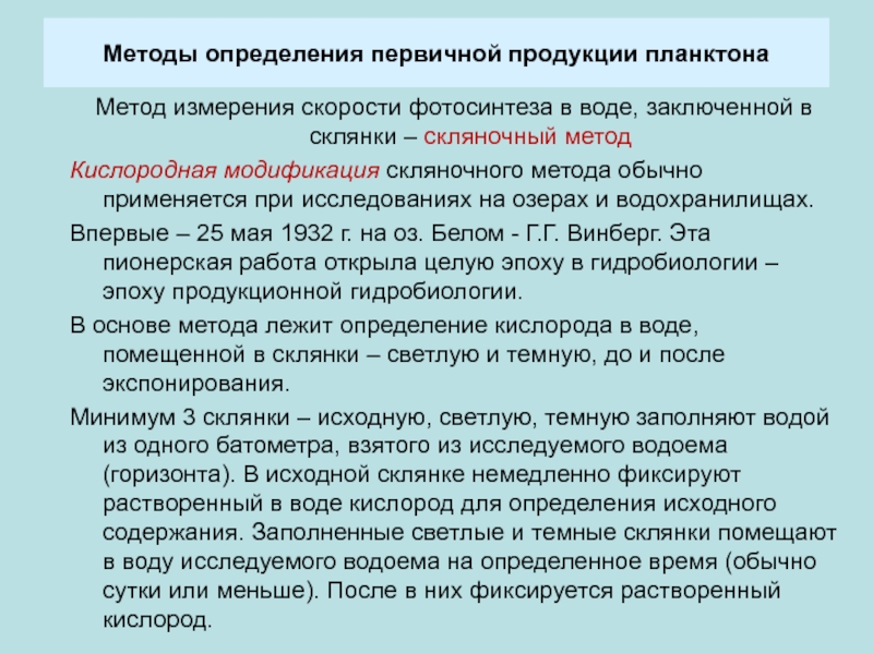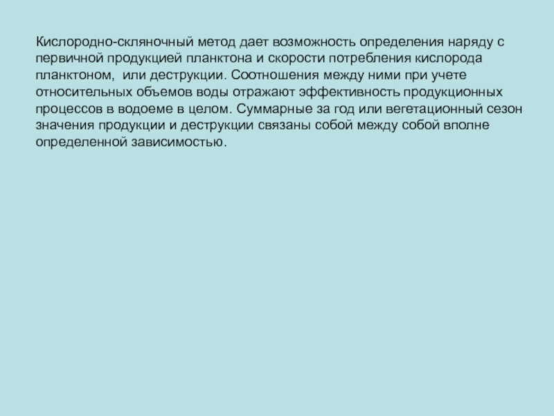 Слайд 18Кислородно-скляночный метод дает возможность определения наряду с первичной продукцией планктона