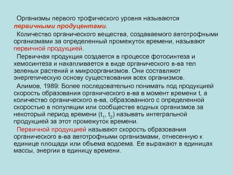 Первичной продукцией называют скорость образования органического в-ва автотрофными организмами, отнесенную к единице площади или объема водоема. Ее выражают в единицах массы, энергии в единицу времени.