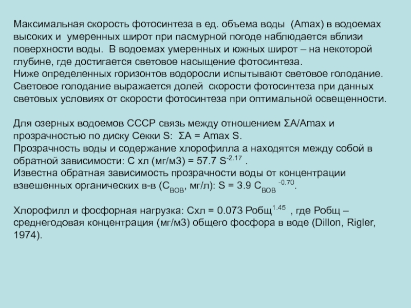 Хлорофилл и фосфорная нагрузка: Схл = 0.073 Робщ1.45 , где Робщ – среднегодовая концентрация (мг/м3) общего фосфора в воде (Dillon, Rigler, 1974).