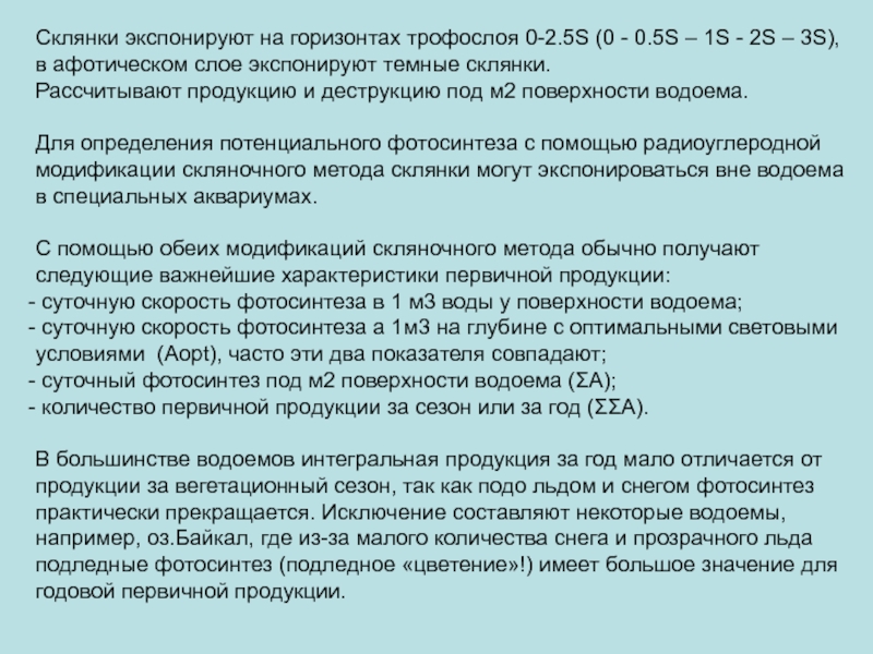 В большинстве водоемов интегральная продукция за год мало отличается от продукции за вегетационный сезон, так как подо льдом и снегом фотосинтез практически прекращается. Исключение составляют некоторые водоемы, например, оз.Байкал, где из-за малого количества снега и прозрачного льда подледные фотосинтез (подледное «цветение»!) имеет большое значение для годовой первичной продукции.