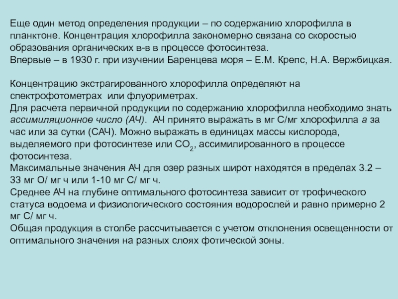 Слайд 14Еще один метод определения продукции – по содержанию хлорофилла в