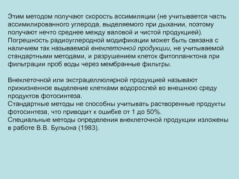 Погрешность радиоуглеродной модификации может быть связана с наличием так называемой внеклеточной продукции, не учитываемой стандартными методами, и разрушением клеток фитопланктона при фильтрации проб воды через мембранные фильтры.