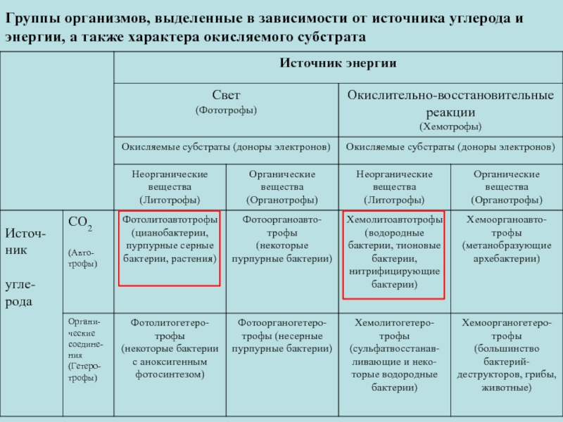 Слайд 3Группы организмов, выделенные в зависимости от источника углерода и энергии,