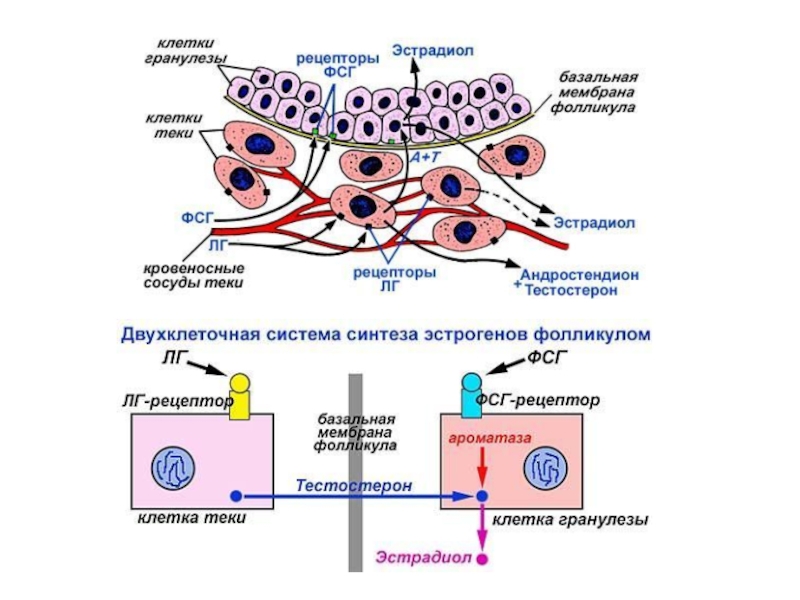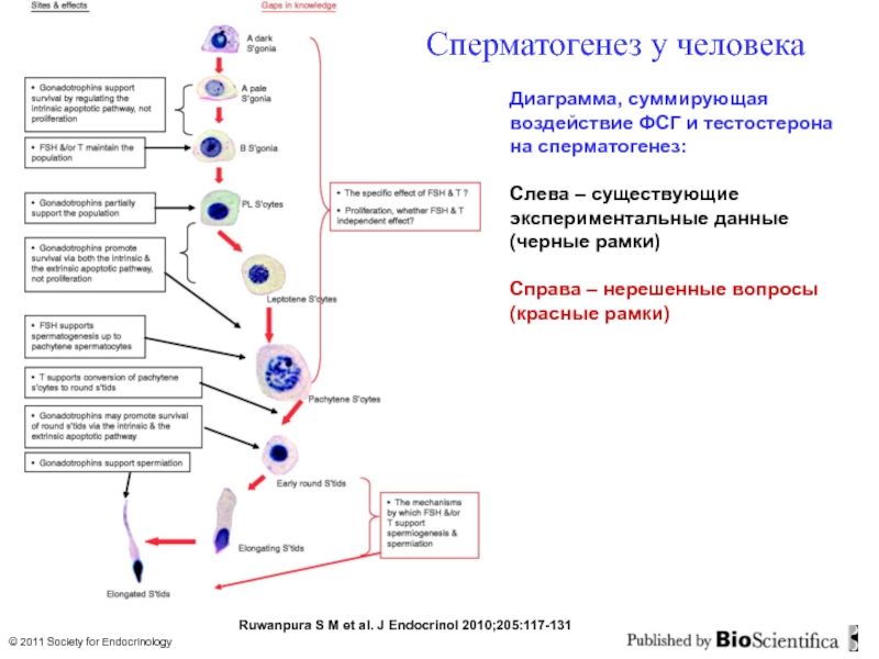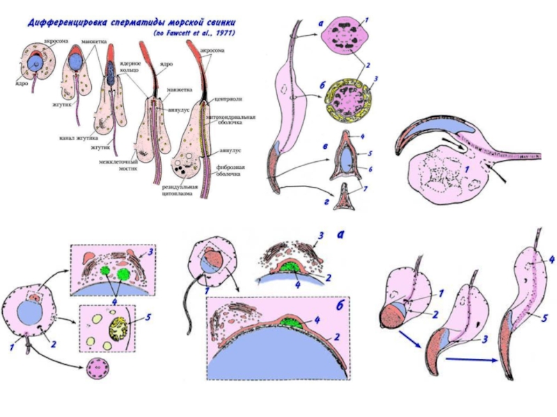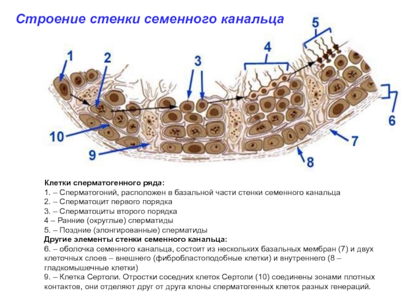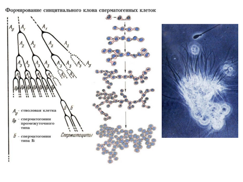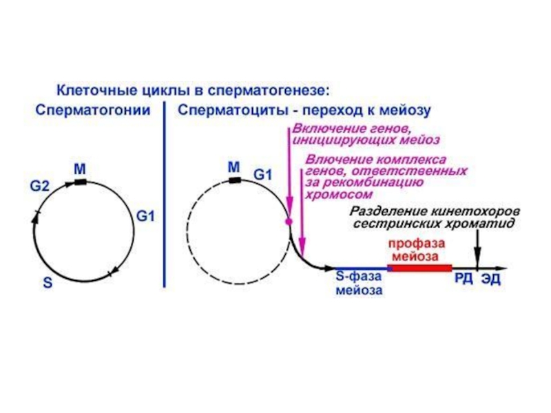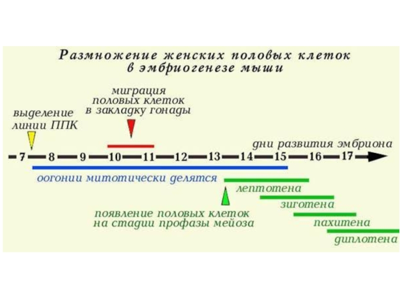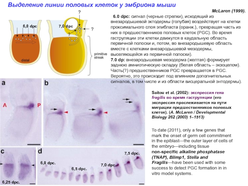 6.0 dpc: сигнал (черные стрелки), исходящий из внезародышевой эктодермы (голубая) воздействует на клетки проксимального слоя эпибласта (оранж.), превращая часть из них в предшественников половых клеток (PGC). Во время гаструляции эти клетки движутся в каудальную область первичной полоски и, потом, во внезародышевую область вместе с клетками внезародышевой мезодермы, выселяющейся из первичной полоски).