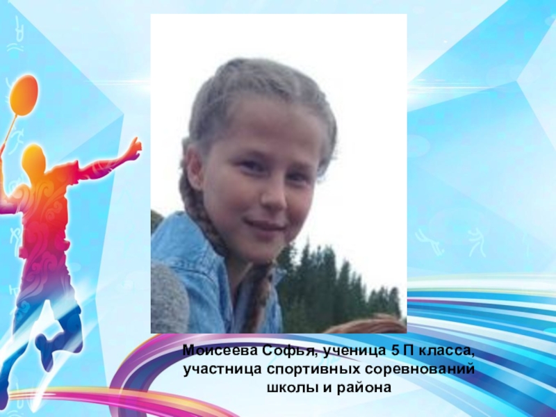 Слайд 10Моисеева Софья, ученица 5 П класса, участница спортивных соревнований школы