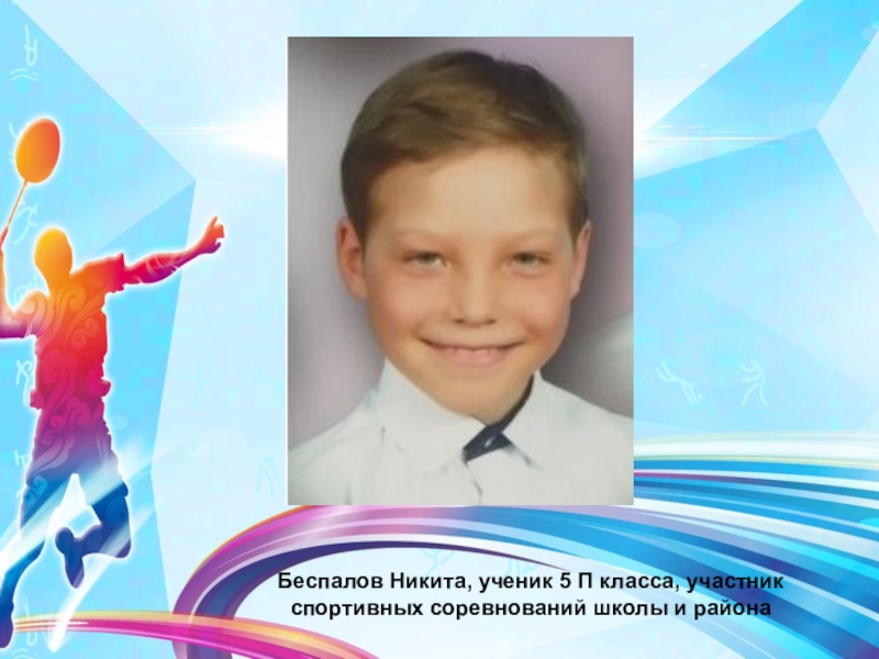 Слайд 12Беспалов Никита, ученик 5 П класса, участник спортивных соревнований школы