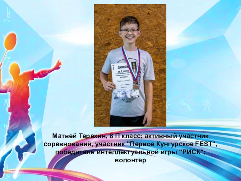 Слайд 7Матвей Терехин, 8 П класс; активный участник соревнований, участник "Первое