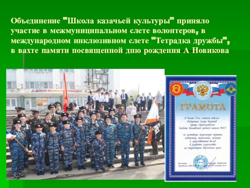 Слайд 18Объединение "Школа казачьей культуры" приняло участие в межмуниципальном слете волонтеров,