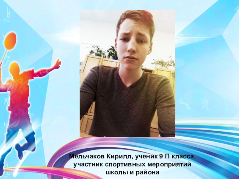 Слайд 6Мельчаков Кирилл, ученик 9 П класса, участник спортивных мероприятий школы
