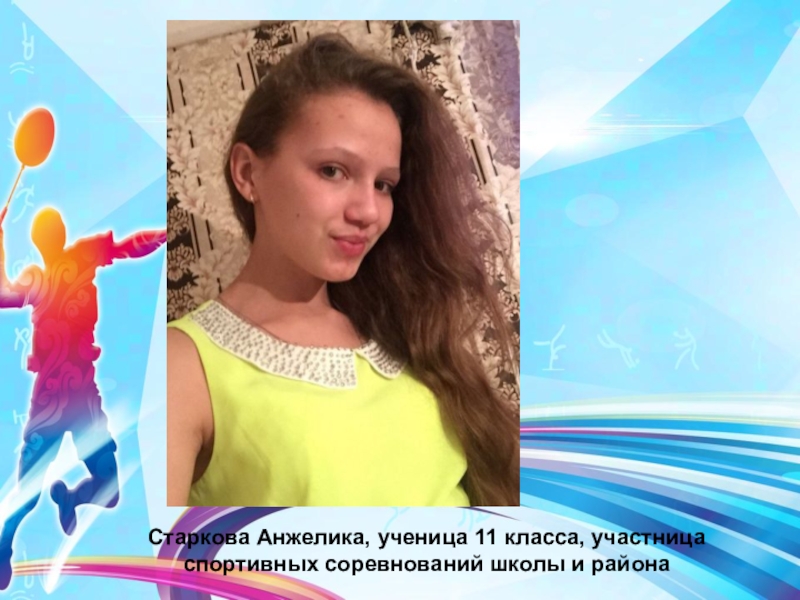 Слайд 4Старкова Анжелика, ученица 11 класса, участница спортивных соревнований школы и