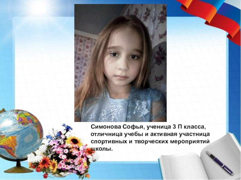 Слайд 43Симонова Софья, ученица 3 П класса, отличница учебы и активная