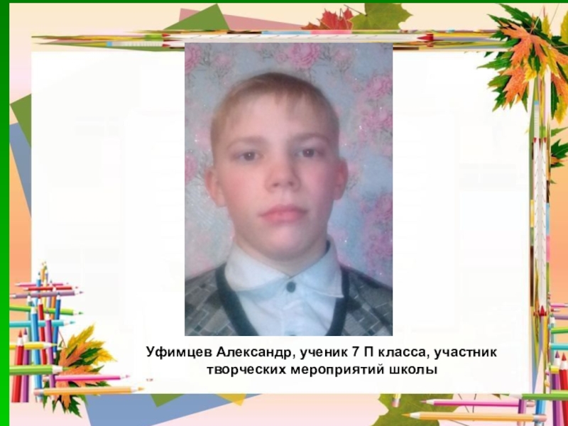 Слайд 26Уфимцев Александр, ученик 7 П класса, участник творческих мероприятий школы