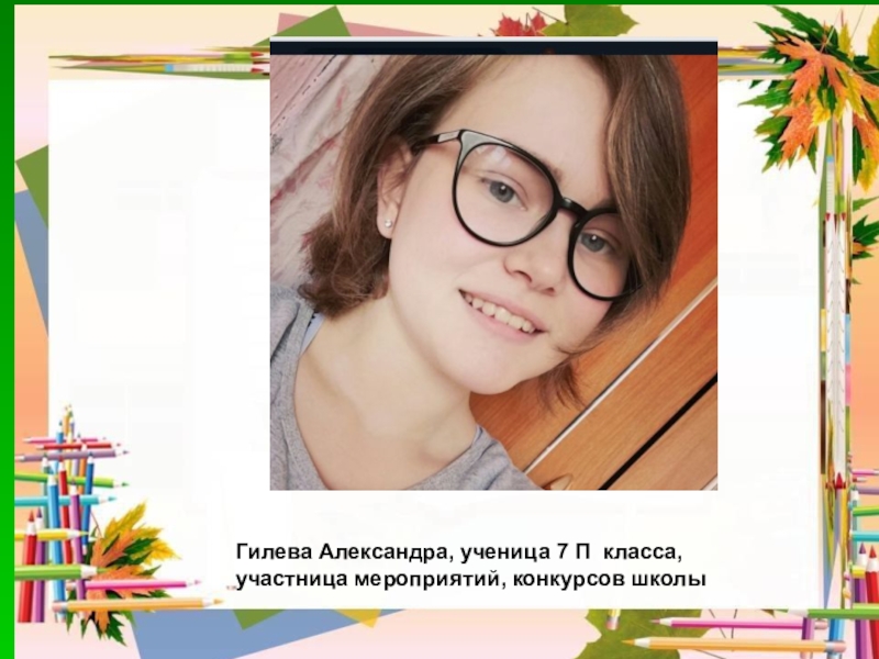 Слайд 24Гилева Александра, ученица 7 П класса, участница мероприятий, конкурсов школы
