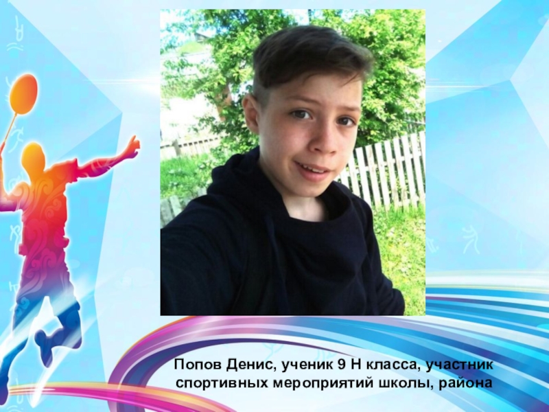 Слайд 5Попов Денис, ученик 9 Н класса, участник спортивных мероприятий школы,