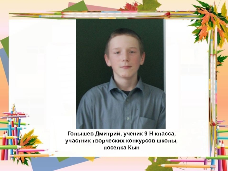 Слайд 21Голышев Дмитрий, ученик 9 Н класса, участник творческих конкурсов школы,