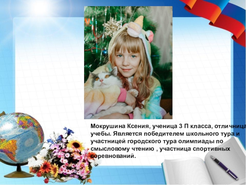 Слайд 42Мокрушина Ксения, ученица 3 П класса, отличница учебы. Является победителем